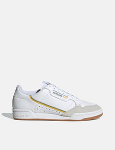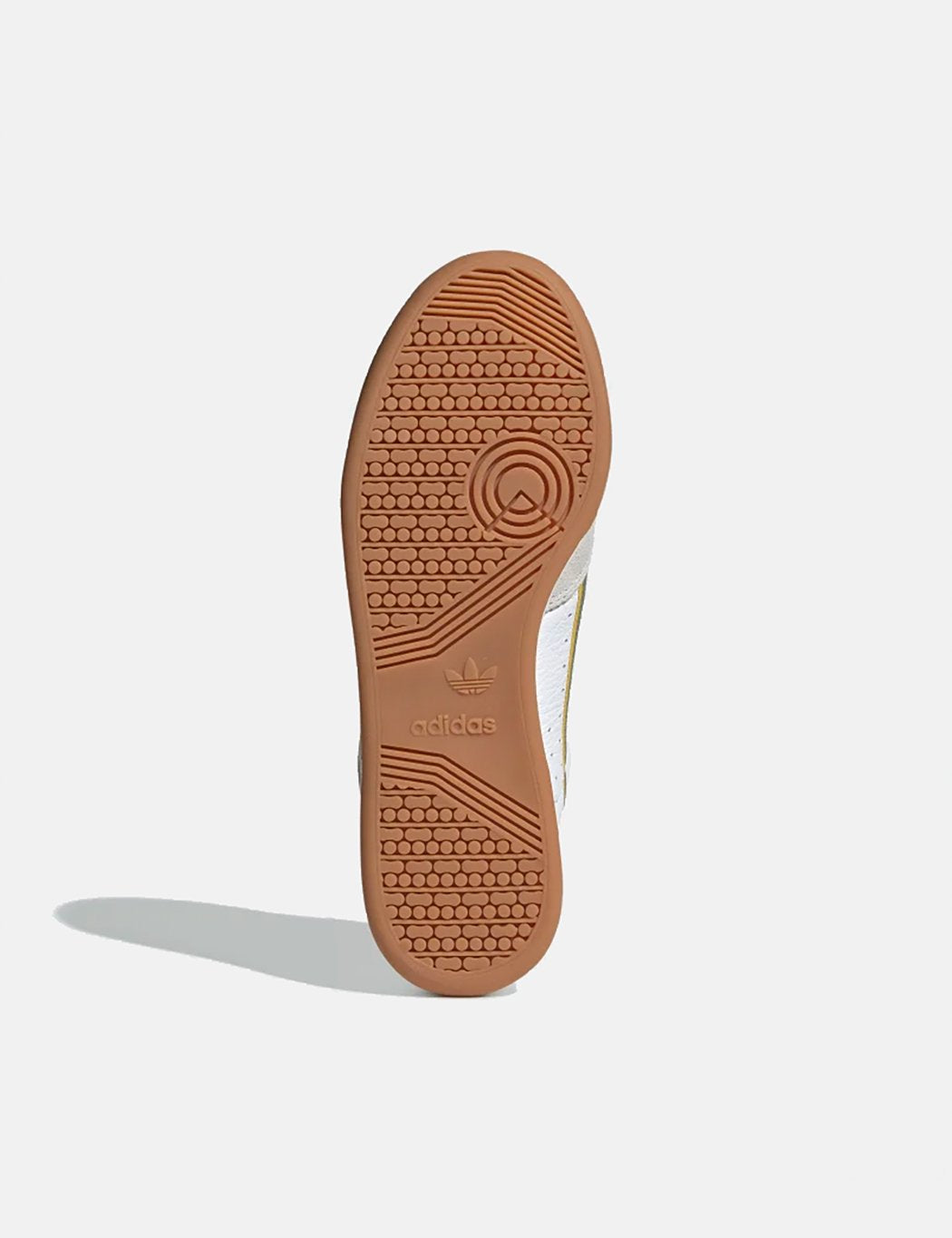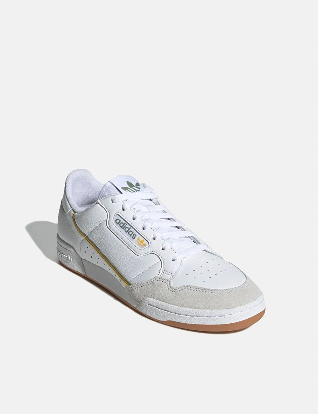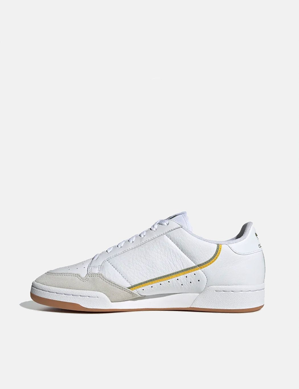 The Adidas Continental 80 shoes capture the retro look of '80s tennis style. These Adidas low-top leather trainers show off a swooping two-tone stripe on the side and a split rubber cupsole.