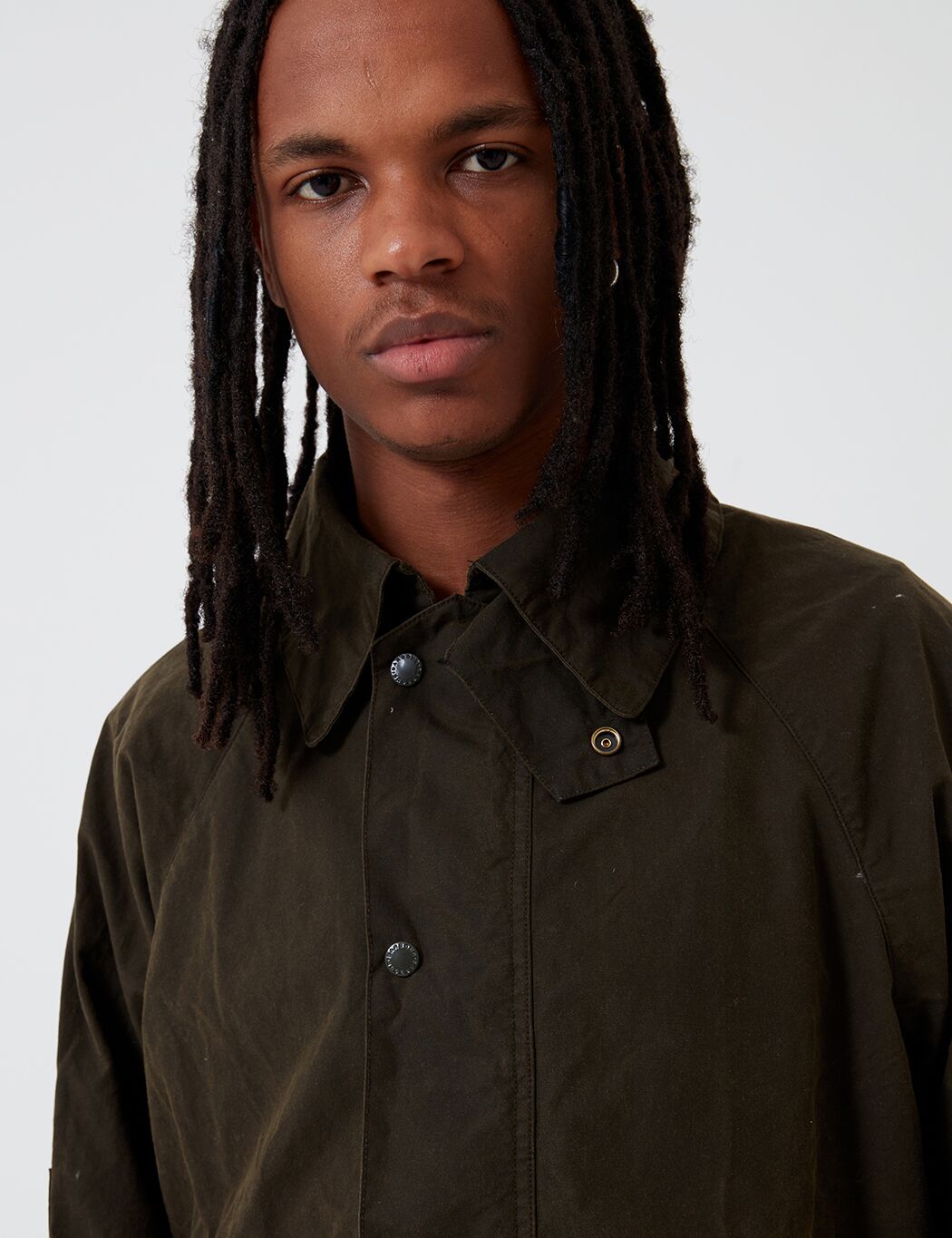 The Engineered Garments x Barbour Graham Casual jacket in washed waxed cotton. Developed with inspiration from the heritage Beaufort jacket, it features a sit down collar and zip rear game pocket.