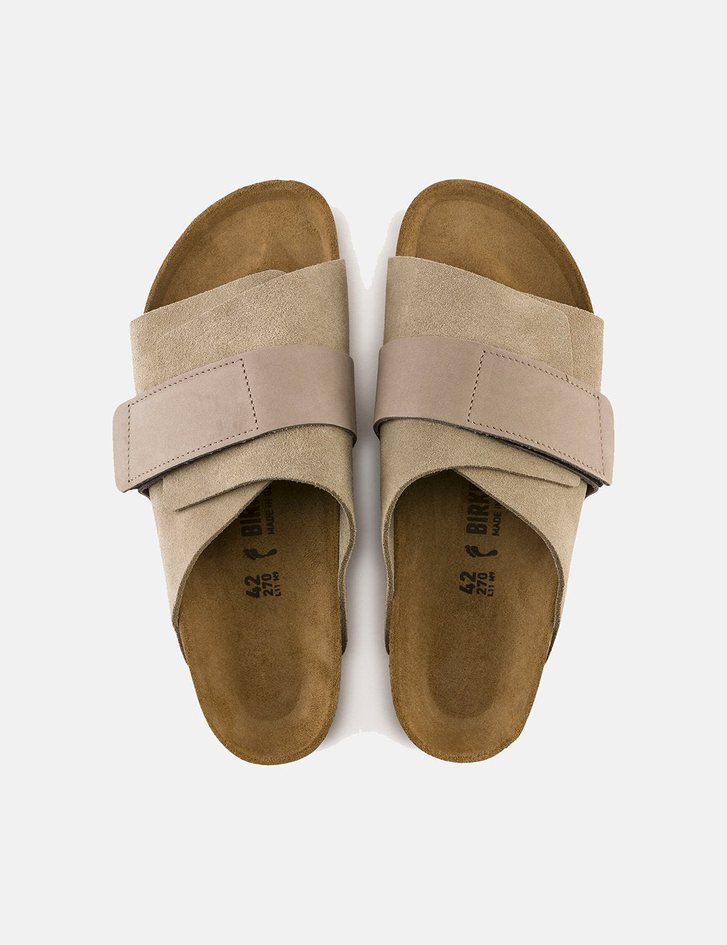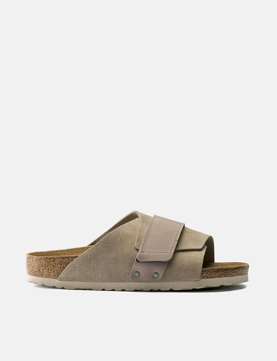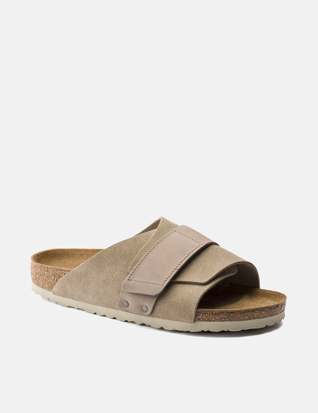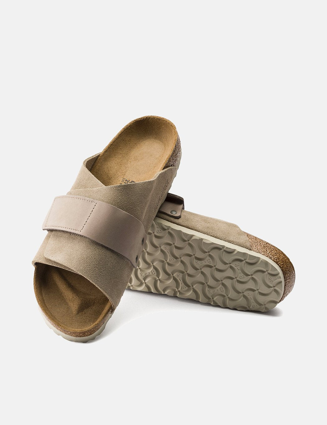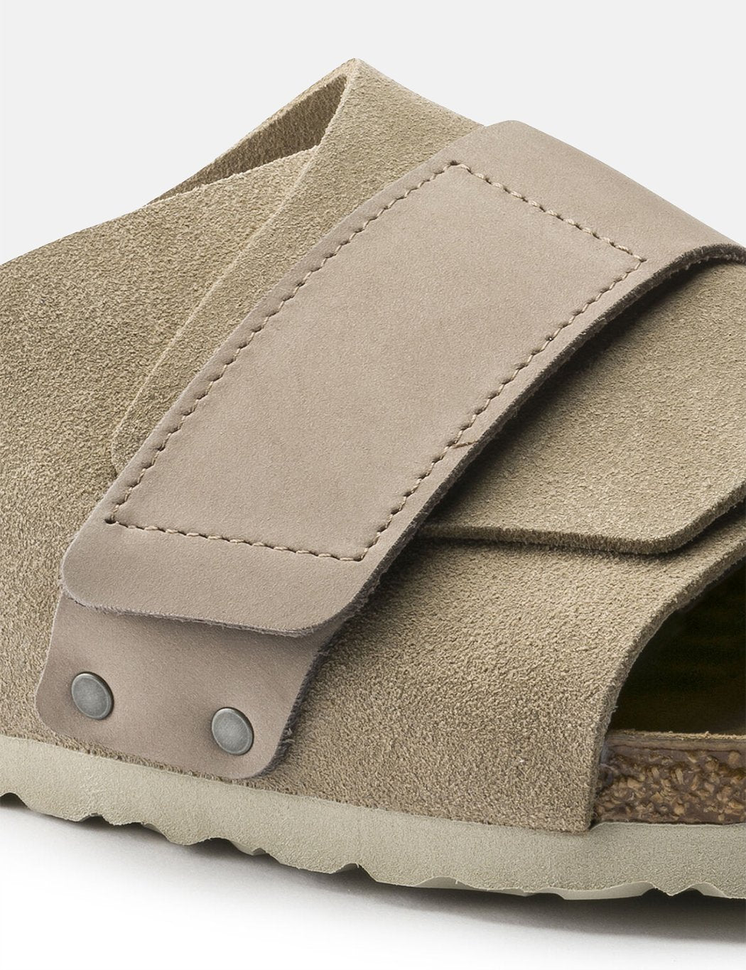 Birkenstock Kyoto Nubuck/Suede Leather (Narrow Footbed) in Taupe from the Birkenstock sandals classic collection.