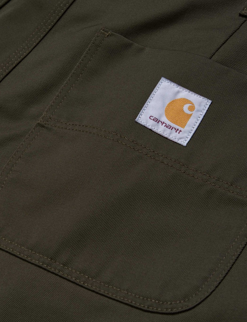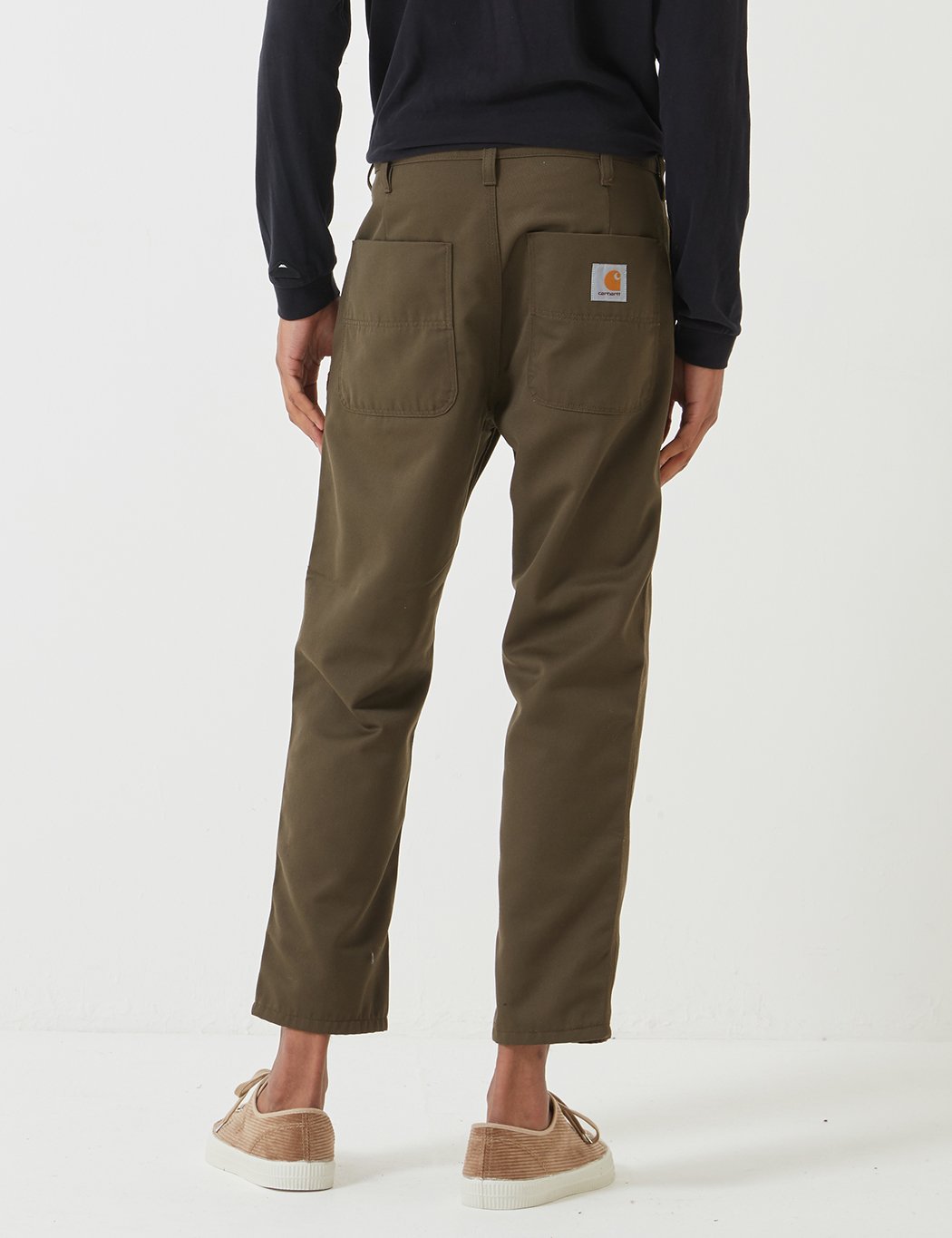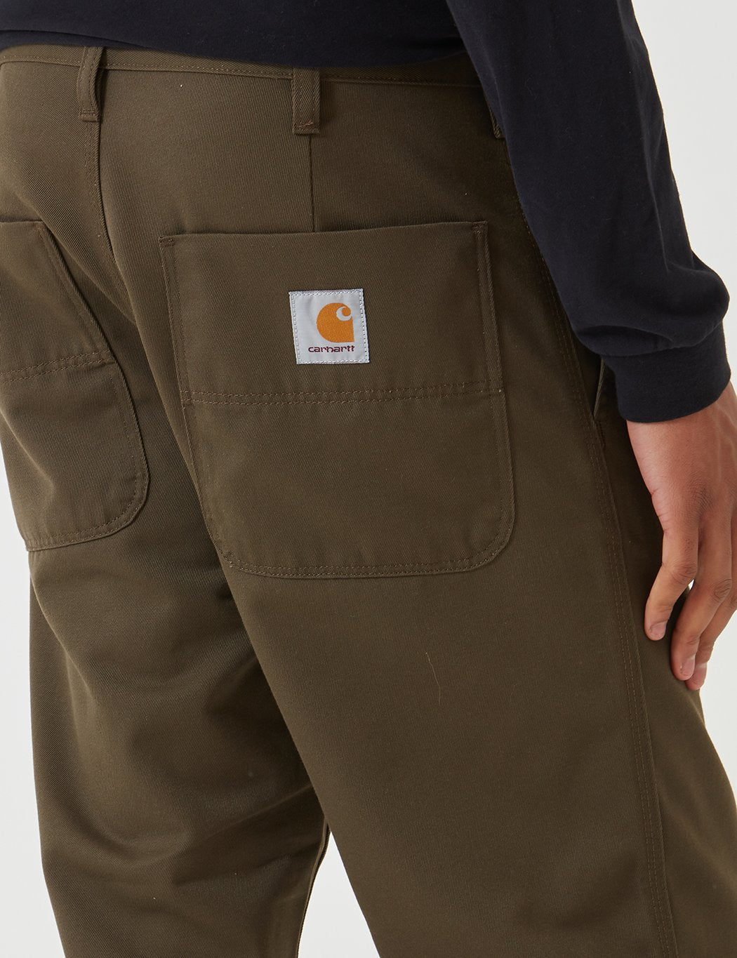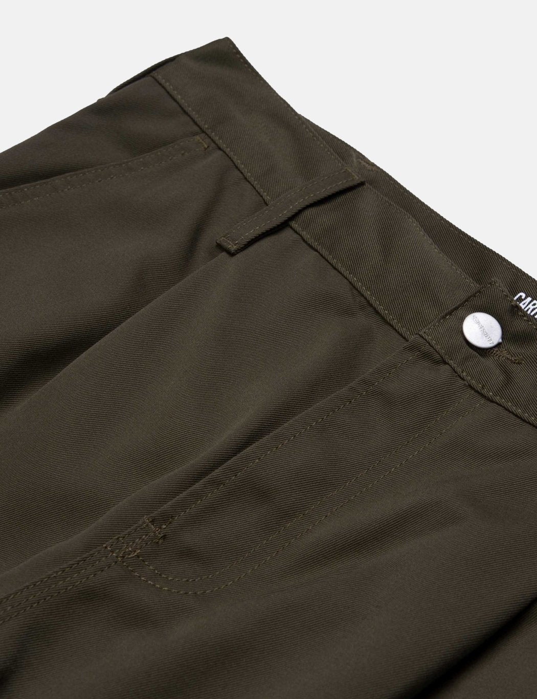 The Carhartt WIP Abbot Pant in rinsed cypress green twill in a regular tapered fit, featuring triple stitching, workwear style square rear pockets with Carhartt patch branding.