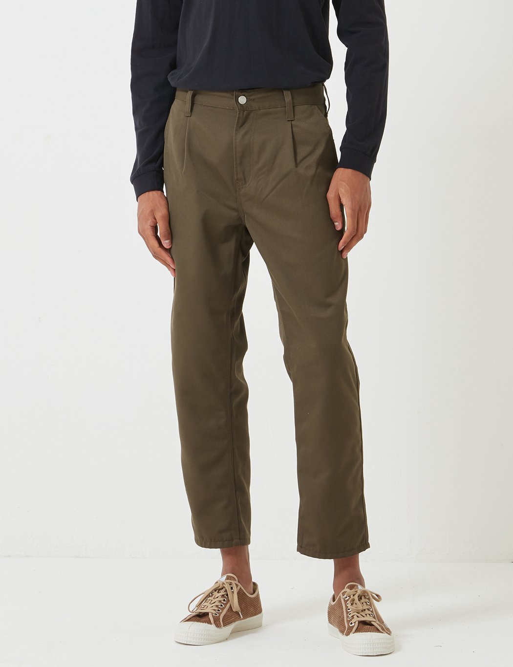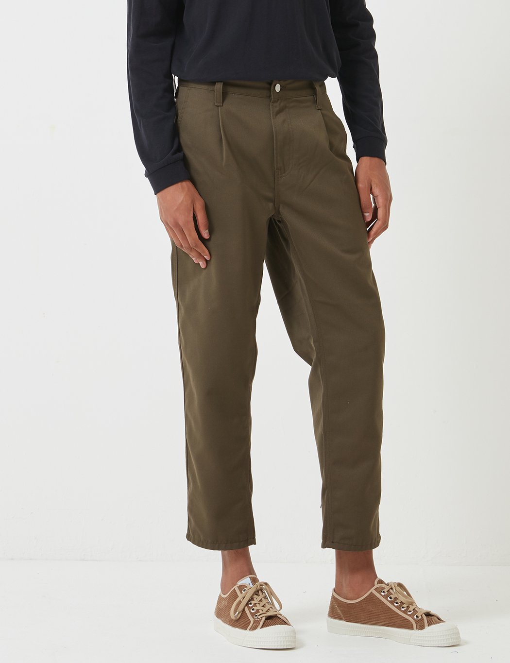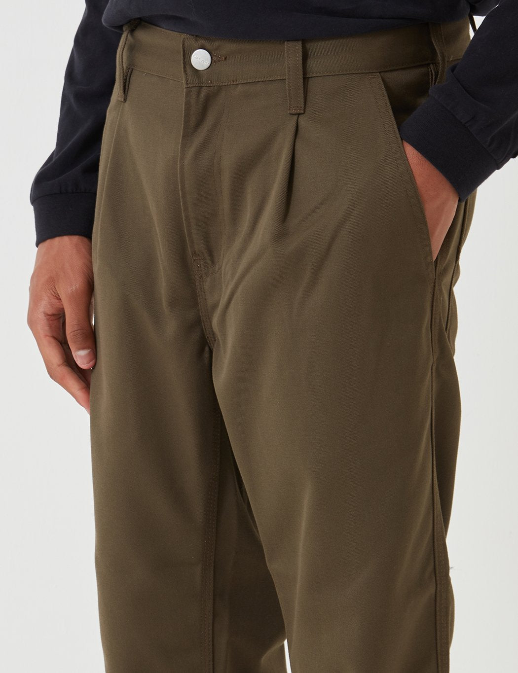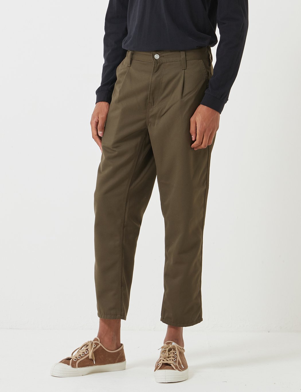 The Carhartt WIP Abbot Pant in rinsed cypress green twill in a regular tapered fit, featuring triple stitching, workwear style square rear pockets with Carhartt patch branding.