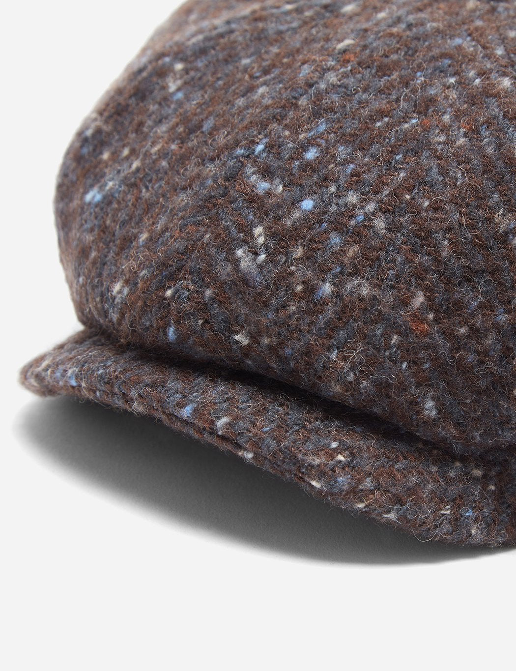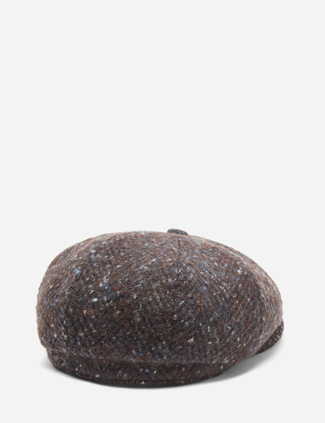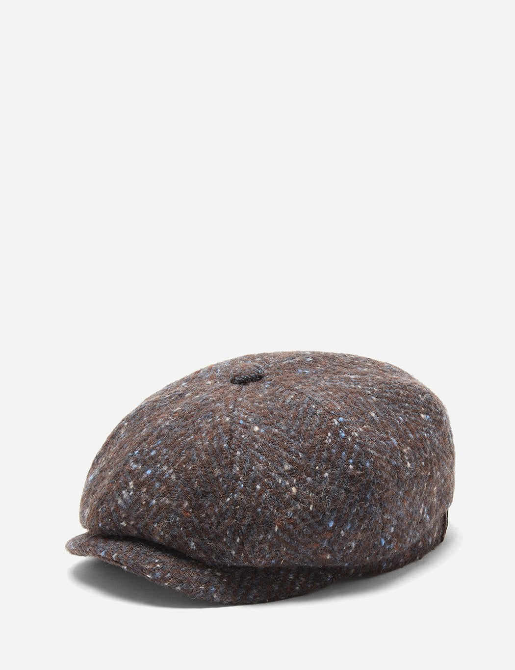 The Stetson Hatteras newsboy cap in brown heavy wool herringbone, with a blue and white fleck tweed from the Stetson Hatteras newsboy caps core collection.
